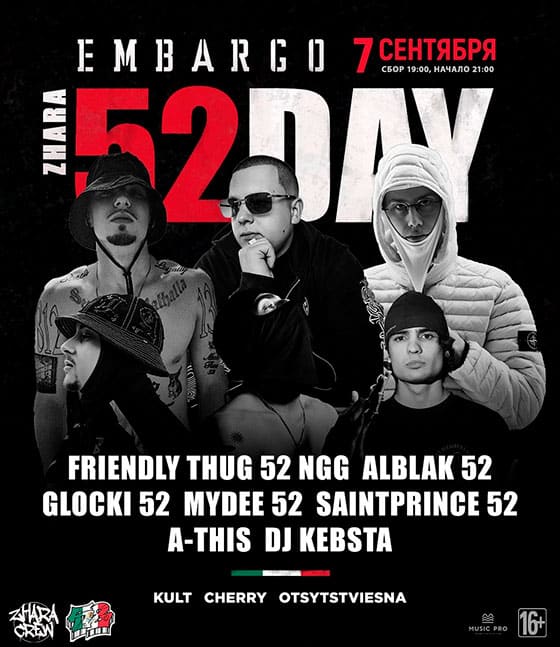 Полный состав объединения соберется впервые, чтобы прокачать уличную культуру, поделиться свежим саундом, любовью к звуку и близким под открытым небом. Неотъемлемой частью фестиваля станут и диджей сеты от команды @zharacrewrnd, которые смогут задать правильную атмосферу всего мероприятия! Live: Friendly Thug 52 Ngg, Alblak 52, Glocki 52, SaintPrince 52, MyDee52, A-This, Dj Kebsta.