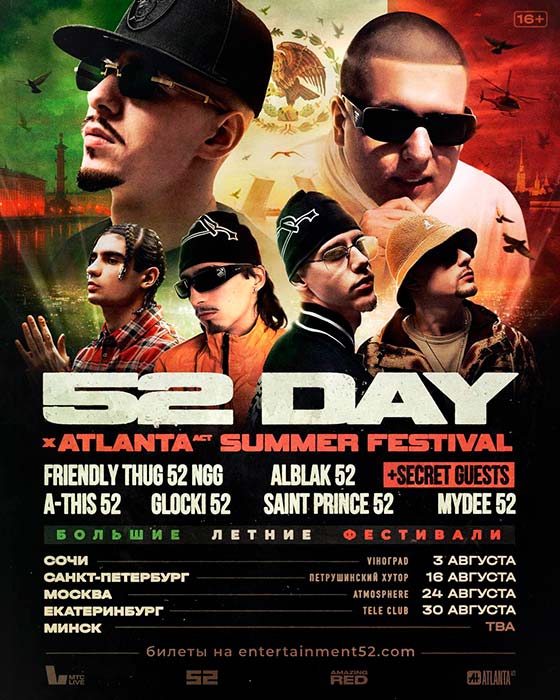 В этом году мы встретимся с парнями из объединения 52 и другими знакомыми тебе исполнителями: FRIENDLY THUG 52 NGG, ALBLAK 52, GLOCKI 52, A-THIS 52, MYDEE 52, SAINT PRINCE 52 + SECRET GUESTS в нескольких городах