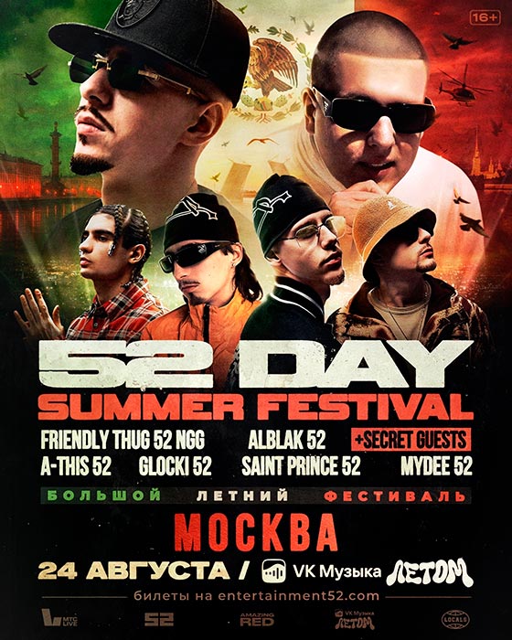 В этом году мы встретимся с парнями из объединения 52 и другими знакомыми тебе исполнителями: FRIENDLY THUG 52 NGG, ALBLAK 52, GLOCKI 52, A-THIS 52, MYDEE 52, SAINT PRINCE 52 + SECRET GUESTS в нескольких городах